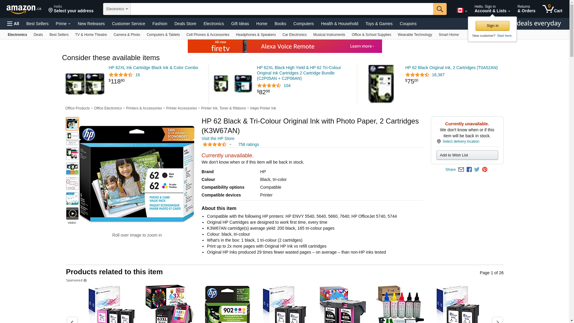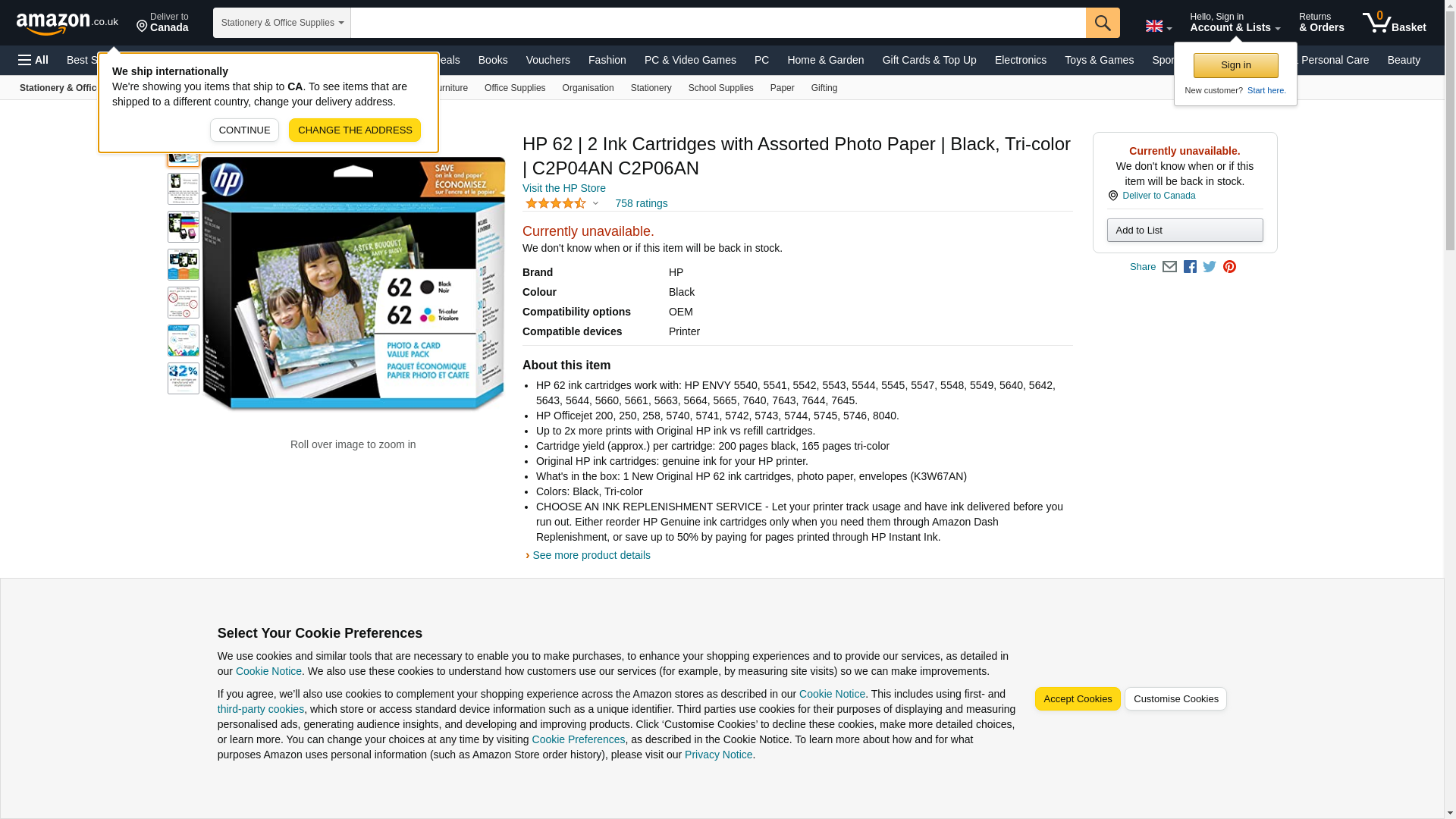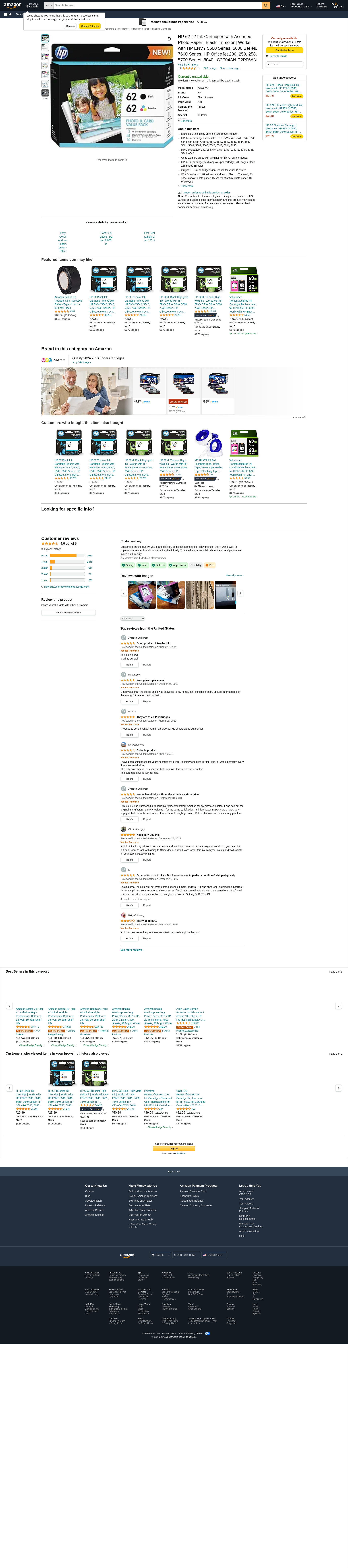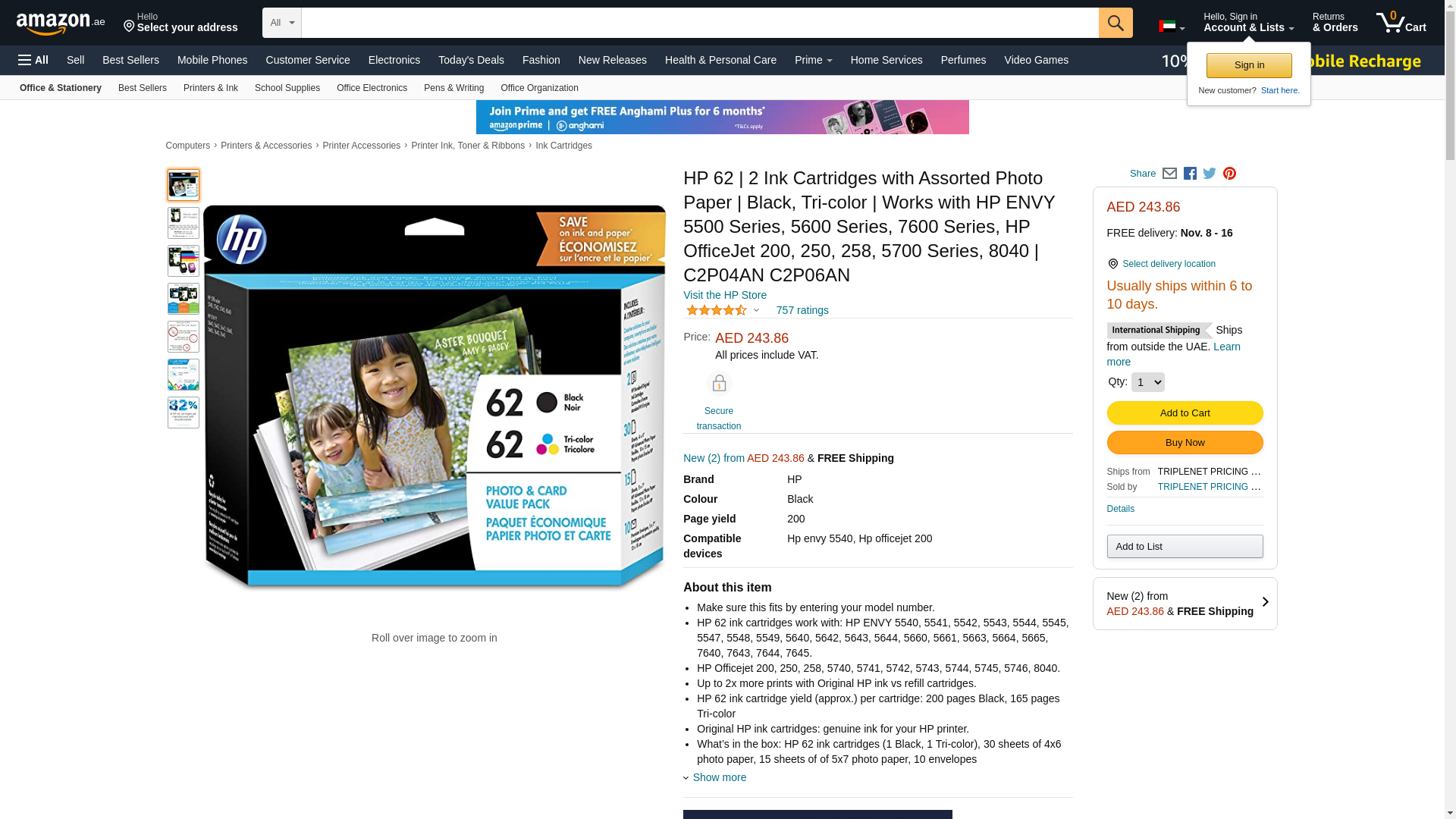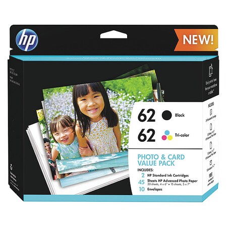 - What’s in the box: HP 62 ink cartridges (1 Black, 1 Tri-color), 30 sheets of 4x6 photo paper, 15 sheets of of 5x7 photo paper, 10 envelopes