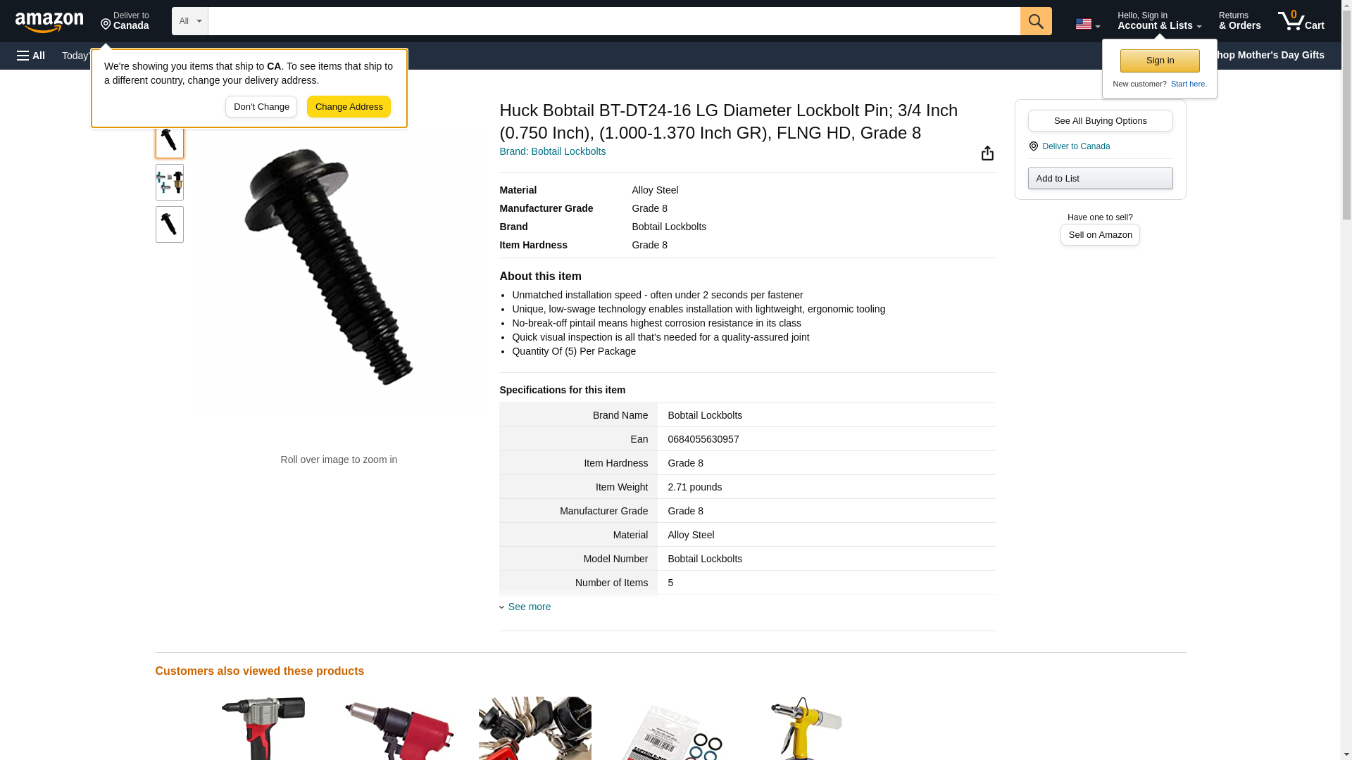 Huck, BT-DT24-16, Bobtail Lockbolts, Unit of Measure: Inch, Decimal Equivalent Diameter: 0.750 Inch, Minimum Grip: 1.000 Inch, Maximum Grip: 1.370 Inch, Grip Range: 1.000-1.370 Inch, Exposed Pin at Min Grip: 1.098 InchFlanged Head, Steel Body Material, Material Detail: Alloy Steel, Oil Finish Finish, Finish Detail: Oil Finish, Maximum Hole Size: 0.813 Inch, Head Diameter: 1.600 Inch, Head Height: 0.600 Inch, Pin Length to Lock Groove: 0.160 Inch, Pintail Length: 0.535 Inch, Underhead Length to Min Grip: 1.000 Inch, Underhead Length to Pintail: 2.600 Inch, Style: Bobtail Large Diameter Unified, Type: Lockbolt Pin Unified, Shear Strength lbf: 38000, Tensile Strength lbf: 50100, RoHS Compliant: Yes, Country of Origin: United States, ECCN: EAR99, HTS Code: 7318.29.0000