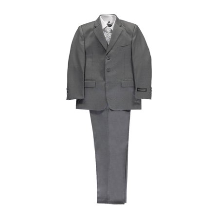 This Kids World suit delivers a sophisticated look thats sure to impress at his next special event. <ul> <li>Kids World 5-piece suit</li> <li>Woven single-breasted jacket with silky lining, flap pockets, and welt chest pocket (100% polyester)</li> <li>Woven vest with welt pockets and silky backing with adjustable strap (100% polyester)</li> <li>Pre-creased pants with angled on-seam front pockets, welt back pockets, and button-and-zip fly with tab closure (100% polyester)</li> <li>Woven button-down shirt with patch chest pocket (65% polyester, 35% cotton)</li> <li>Patterned tie with zip-up closure (100% polyester)</li> <li>Dry clean only</li> <li>Imported</li> </ul>