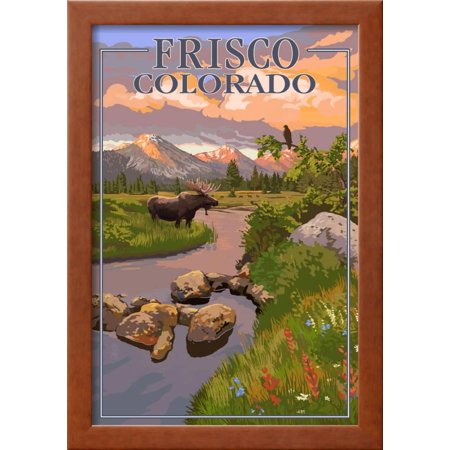 <ul> <li>Title: Frisco, Colorado - Moose and Meadow Scene</li> <li>Artist: Lantern Press</li> <li>Paper Type: Art Print</li> <li>Product Type: Framed Art Print</li> <li>Framed in SOHO Pecan</li> <li>Arrives ready-to-hang for fast, simple installation</li> <li>Framed Size: 15.5x22 in.</li> <li>Handcrafted in the USA</li> </ul>