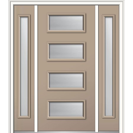 <ul> <li>Door Size: 64"x80"</li> <li>Unit Dimension: 68.5"x81.75"</li> <li>Suggested Rough Opening: 69"x82.25"</li> <li>Fiberglass Smooth</li> <li>4-9/16" Primed Composite</li> <li>4-Lite</li> <li>Frosted Glass; Privacy Rating 9 out of 10</li> <li>Door Prefinished Sandal</li> <li>Left Hand In-Swing</li> <li>Left Hand In-Swing Door Handing - Standing on the inside of your home, if your hinge pins are on your right, you have a Left Hand In-Swing</li> <li>3 Satin Nickel Hinges - 2-1/8" Entry/Deadbolt Bore Prep - *Locks Sold Separately*</li> <li>Brickmould Applied</li> </ul>