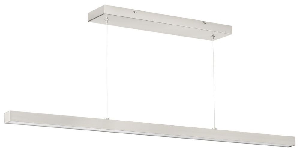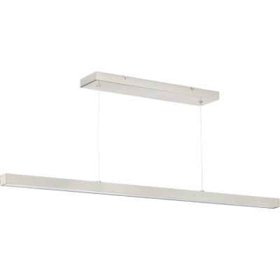 - A smooth metal beam with a brushed nickel finish suspends from the ceiling to add clear visual interest to minimalist residential or commercial settings.