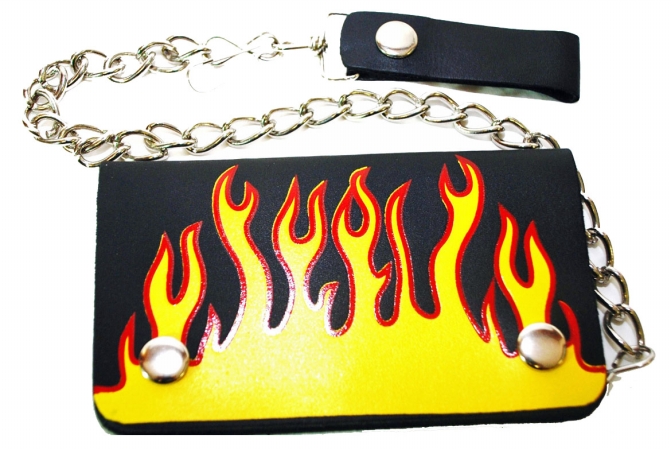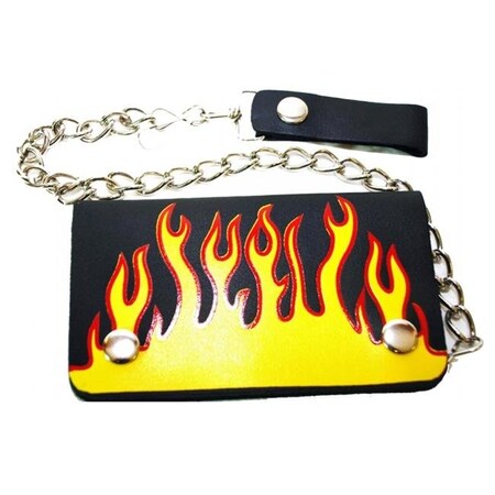 Features. Small front pocket for ID a deep zipper pocket for coins. A small compartment and deep back pocket for larger items.. Full flap with two snap closure.. Bi-fold chain wallet. Size - 6 x 3.5 in. with a 15 in. steel chain. Design - Yellow Flames