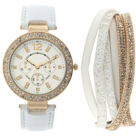 <br /> <b>Ladies Gold Tone Crystal Bezel Watch and Bracelet Set:</b> <br /> <ul> <li>Includes bezel watch and matching wrap bracelet</li> <li>30-minute military and minute times</li> <li>Clear rhinestones throughout</li> <li>Gold-colored hands and numbers</li> <li>White strap</li> <li>Wear together or separately</li> <li>Watch with bracelet set comes in a decorative gift box</li> <li>Ideal for birthdays and holidays</li> </ul>
