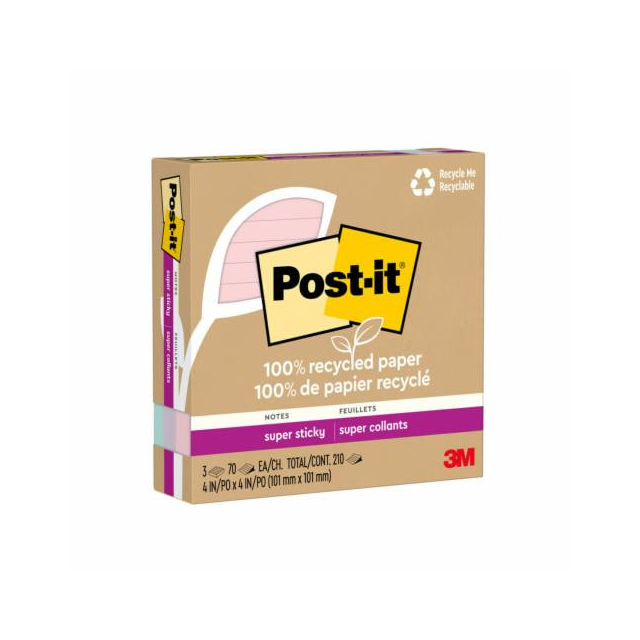 100% Recycled Paper Super Sticky Notes, Ruled, 4 x 4, Wanderlust Pastels, 70 Sheets/Pad, 3PK