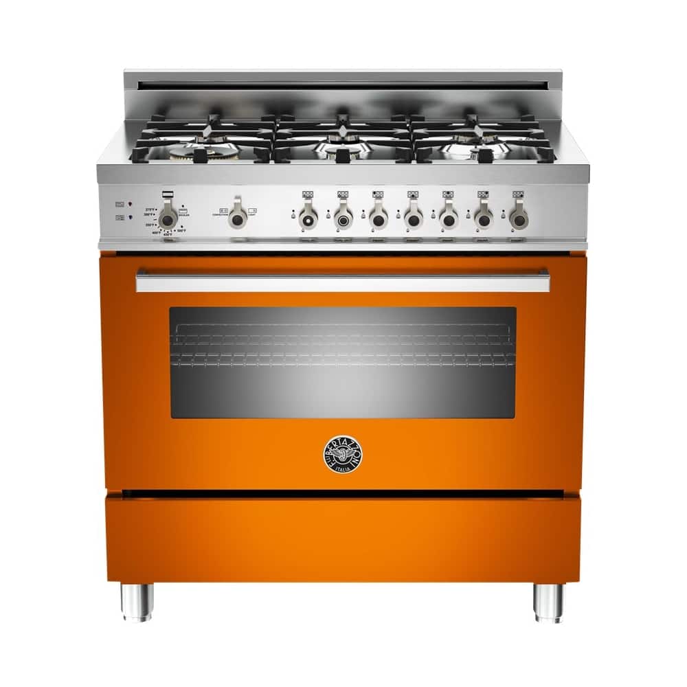 Professional Series 36 Inch Freestanding All Gas Range with Natural Gas, 6 Sealed Brass Burners, 5.9 cu. ft. Total Oven Capacity, Convection Oven, Viewing Window, Continuous Grates, 19000 BTU Power Burner, Sealed Cooktop Burners, Dual Convection Fans, CSA Certified, Cast Iron Grates, Soft Motion Door, Temperature Gauge, Infrared Broiler, Telescopic Glide Shelf, Metal Coated Knobs, Sabbath Mode in Arancio Orange