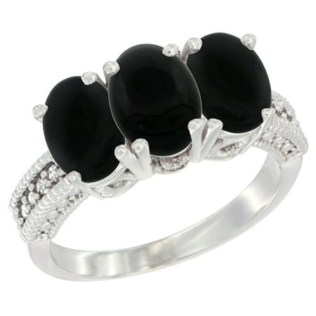 14K White Gold Natural Black Onyx Ring 3-Stone 7x5 mm Oval Diamond Accent, sizes 5 - 10