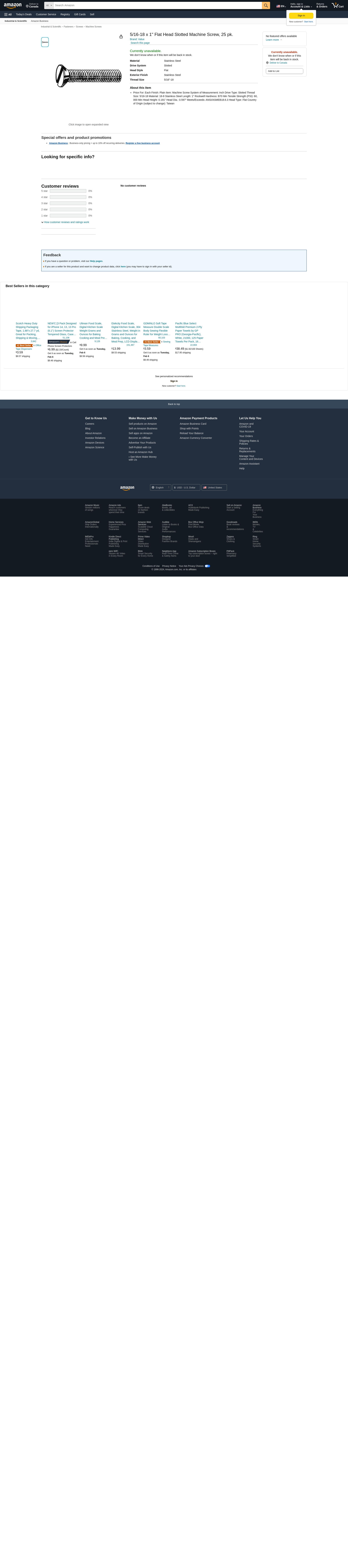 | Feature | Price For: Each Finish: Plain Item: Machine Screw System of Measurement: Inch Drive Type: Slotted Thread Size: 5/16-18 Material: 18-8 Stainless Steel Length: 1" Rockwell Hardness: B70 Min Tensile Strength (PSI): 60, 000 Min Head Height: 0.191" Head Dia.: 0.597" Meets/Exceeds: ANSI/ASMEB18.6.3 Head Type: Flat Country of Origin (subject to change): Taiwan |