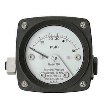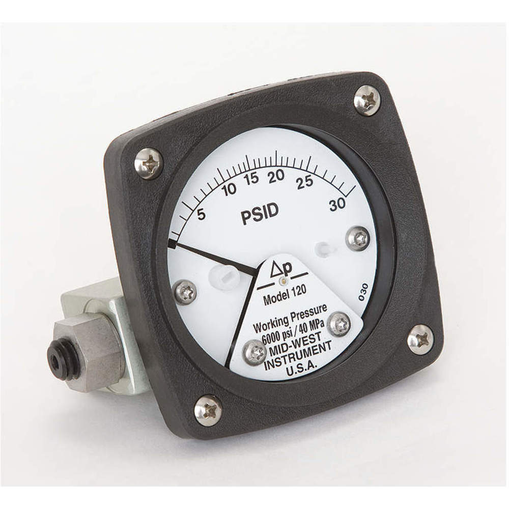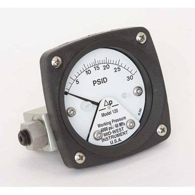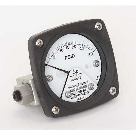 Mid-West 120-AA-00-OO-30P Differential Pressure Gauge with Aluminum Body and Stainless Steel Internals, Piston Type, 3/2/3% Full Scale Accuracy, 2-1/2" Dial, 1/4" FNPT Back Connection, 0-30 psid Range, 3000 psig SWP