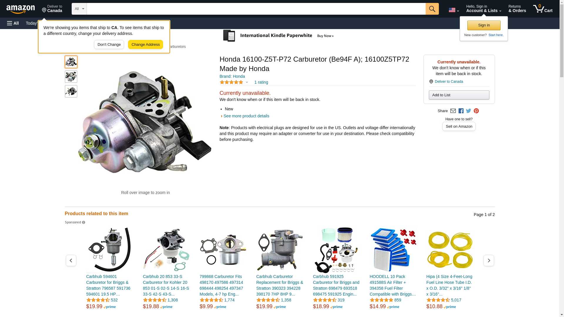 - Honda replacement carburetor (be94f a), part number 16100-Z5T-P72