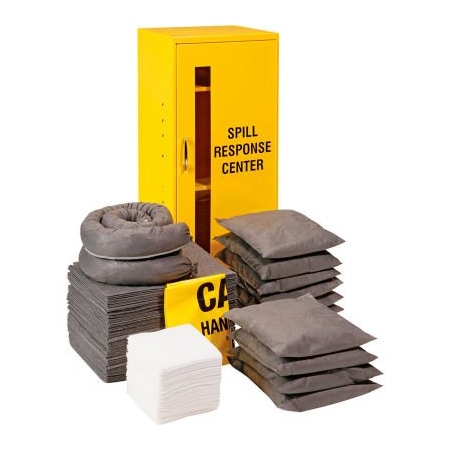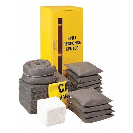 - Includes: 75 - 10" X 14" Gray Universal Pads; 2 - 3" x 4' Gray Universal Socks; 10 - 10" x 10" Gray Universal Pillows; 4 - 18" X 30" Yellow Disposal Bags & Ties; 1 - 12.75" x 13.75" x 30" Wall Mount Cabinet; 2 - 25/pkg Wipers