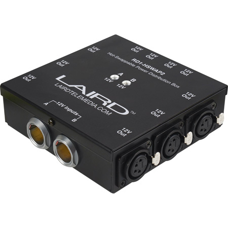 A 12-Volt Version of the RD1-HSWAP1 with Twin 12V inputs utilizing LEMO 3B 8 pin connectors. Save valuable time & simplify your digital cinema camera power management. Keep two power sources active at the same time & changeover one at any time. This auto-sensing hot swap power distribution box will automatically switch to the most reliable source. Twin 12-Volt inputs utilizing a LEMO 3B 8 pin inputs compatible with industry standard power cables as found on Anton Bauer VCLX, Panavision Genesis, IDX and other AC-DC power sources. Perfect for Red One, Epic/Scarlet, Sony F3 & other professional digital cinema equipment as well as 3D rigs. <strong>Ten Outputs:</strong> (6) 4-pin XLRs, (2) 6-pin Lemo connectors & (2) 3-pin Lemo split gender 12V 3-pin connectors. All ten outputs feature self-resetting fuses. The hot swap function is on the input side only, while outputs remain constant. LED's to indicate power input sources. High quality aircraft aluminum ruggedized housing: 4.5" x 4.5" x 1.5".</p>