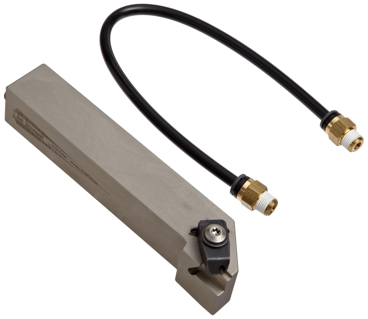 The advanced design of the JetStream threading bar offers the ability to use the front coolant port to flush chips out of the way so that they do not get packed or re-cut, by simply installing the supplied coolant nozzle screw. This will help prevent damage to the insert, the tool itself and even the part that is being cut. If this is not necessary in an application just replace the coolant screw with the already supplied solid screw and this will disable the front coolant port and use only the coolant port at the tip of the insert. PVD-TiN, Materials and quality: The body's of the Jet-Stream toolholders are built with chromuim-molybdenum alloy steel. This material features properties of high tensile strength and high yield stress resistance. This material is heat treated to 40-44Rc and electoless nickel coated. Electoless nickel coating will prevent the tools against rust providing a long tool life under severe working conditions. Style S - external DorNotch toolholder for threading and grooving DorNotch inserts. Left hand cut.