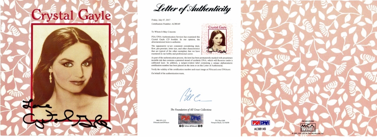 Real Deal Memorabilia CGayleCDBook-PSA Crystal Gayle Autographed CD Book Cover & Crystal Gayle CD - Full Letter