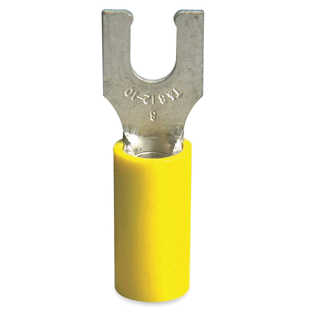 | Feature | Price For: Each Insulation Color: Yellow Item: Fork Terminal Stud Size: #10 Connection Material: Copper Seam: Brazed Standards: UL Listed, CSA Certified Wire Range: 12 to 10 AWG Overall Length: 1.090" Insulation Type: Vinyl Connection Type: Crimp Max. Voltage: 600V Terminal Type: Locking Max. Temp.: 221 Degrees F |