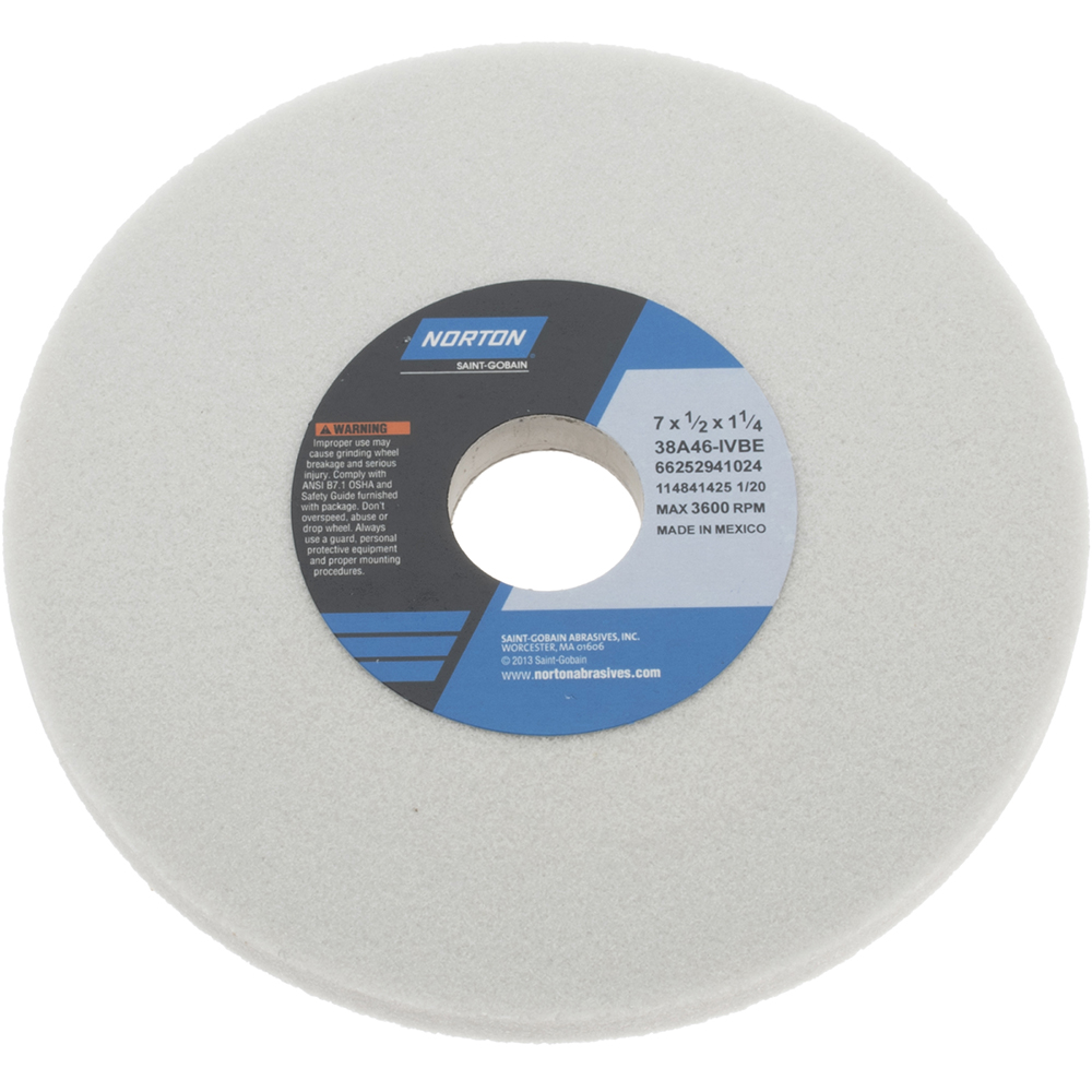 <br /><br /> Item: Straight Grinding Wheel<br /> Abrasive Wheel Type: Type 1<br /> Abrasive Wheel Diameter: 7"<br /> Thickness: 1/2"<br /> Arbor Hole Size: 1-1/4"<br /> Abrasive Material: Aluminum Oxide<br /> Abrasive Grit: 46<br /> Abrasive Wheel Hardness: I<br /> Max. RPM: 3600<br /> Series: 38A<br /> Specification: 38A46-IVBE<br /> Grade: Coarse<br /> Bond Type: Vitrified<br /> Color: White<br /> Application: For Iron, High Speed Steel and Tool Steels RC 50 to 68, 300 and 400 Series Stainless Steels, Soft Steels RC 30 to 45<br />