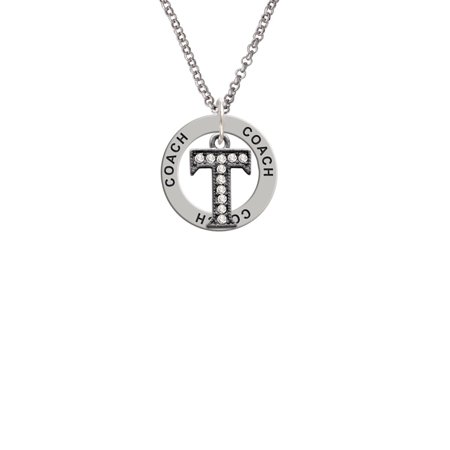 Black Nickel Tone Crystal Black Letter - T - Beaded Border Coach Affirmation Ring Necklace. Black Nickel Tone Charm. Charm size is approx. 0.71 x 0.46 x 0.11 inches (HxWxD) including loop. Silver tone 2mm Belcher Chain Necklace is approx. 23 Inches with a Lobster Claw Clasp. Affirmation Ring is approx. 0.86 x 0.86 x 0.05 (HxWxD). This inspirational piece of jewelry is very meaningful. Its circular shape is symbolic for endless belief in the message that is imprinted around the ring. These are motivational or sentimental messages to the wearer. Makes a great Graduation gift! PLEASE NOTE: Our products are lead safe, but are not intended for children 14 years and younger.