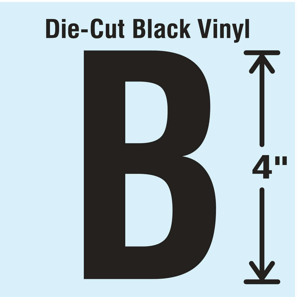 - Price For: Each Die Cut: Yes Character Type: Letters Item: Letter Label Material: Vinyl Color: Black Character: B Overall Width: 2-1/4" Overall Height: 4" Country of Origin (subject to change): United States