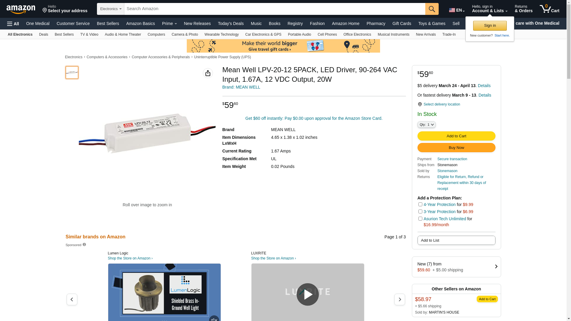 Mean Well LPV-20-12 5PACK, LED Driver, 90-264 VAC Input, 1.67A, 12 VDC Output, 20W