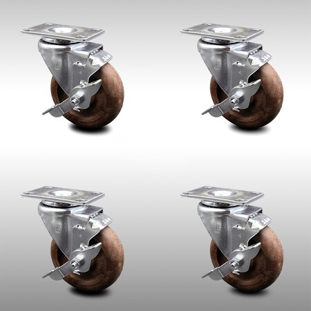 Stainless Steel High Temp Glass Filled Nylon Swivel Top Plate Caster Set of 4 w/4" x 1.25" Brown Wheels - Includes 4 Swivel with Top Lock Brakes - 1400 lbs Total Capacity - Service Caster Brand