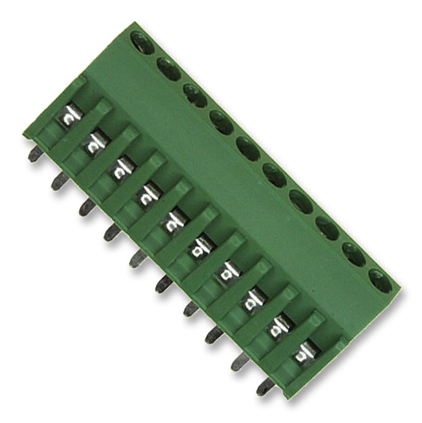 EU RoHS: Compliant with Exemption ECCN (US): EAR99 Part Status: Active Type: Power Terminal Block Gender: HDR Number of Contacts: 10 Terminal Pitch (mm): 15 Number of Rows: 1 Number of Circuits: 10 Termination Method: Solder Body Orientation: Straight Maximum Current Rating (A): 130/Contact Maximum Voltage Rating: 600VAC Insulation Resistance (MOhm): 1000 Minimum Operating Temperature (°C): -40 Maximum Operating Temperature (°C): 110 Packaging: Carton Product Length (mm): 150.7 Product Depth (mm): 31 Product Height (mm): 39 Housing Color: Green Mounting: Through Hole