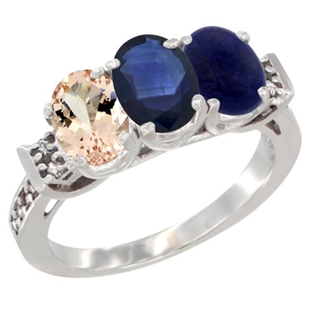 14K White Gold Natural Morganite, Blue Sapphire & Lapis Ring 3-Stone Oval 7x5 mm Diamond Accent, sizes 5 - 10