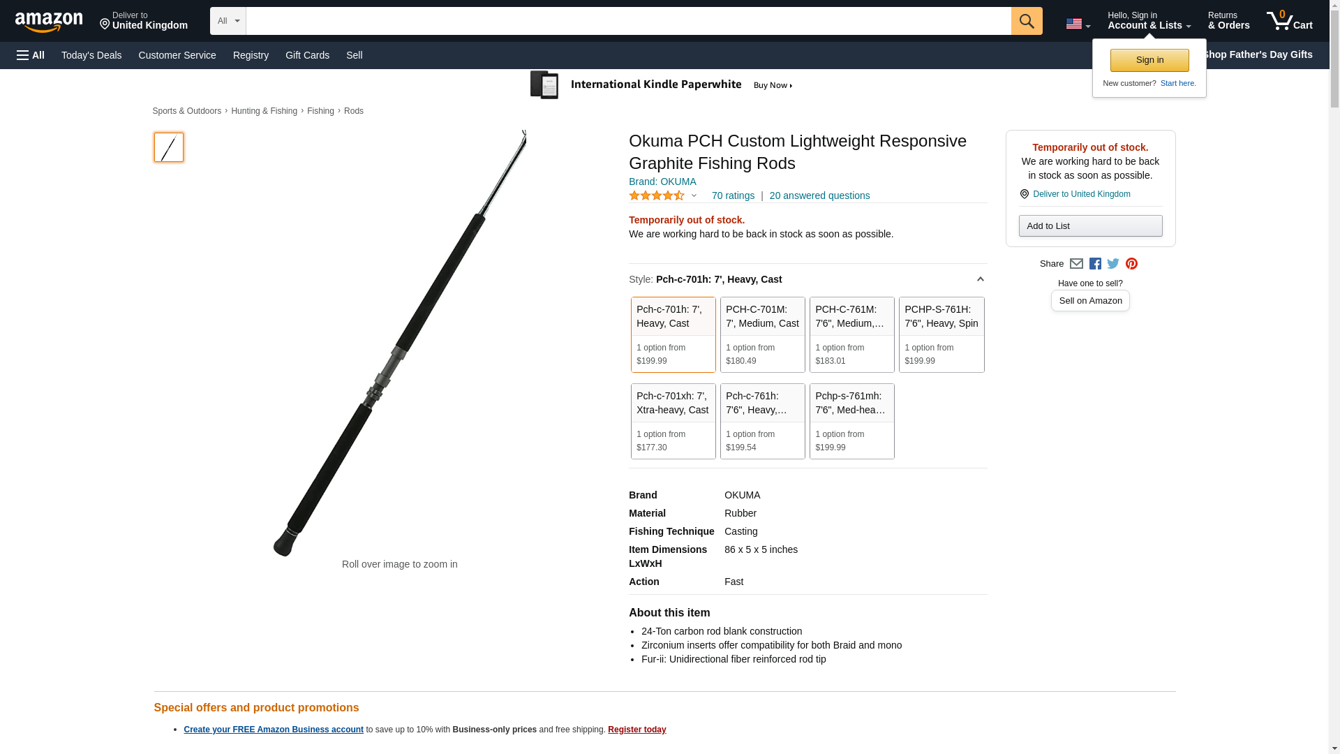 Okuma PCH-C-701H Pch Custom Casting Rod, 7' Length, 1 Piece, 20-50 lb Line Rate, Heavy Power, Fast Action