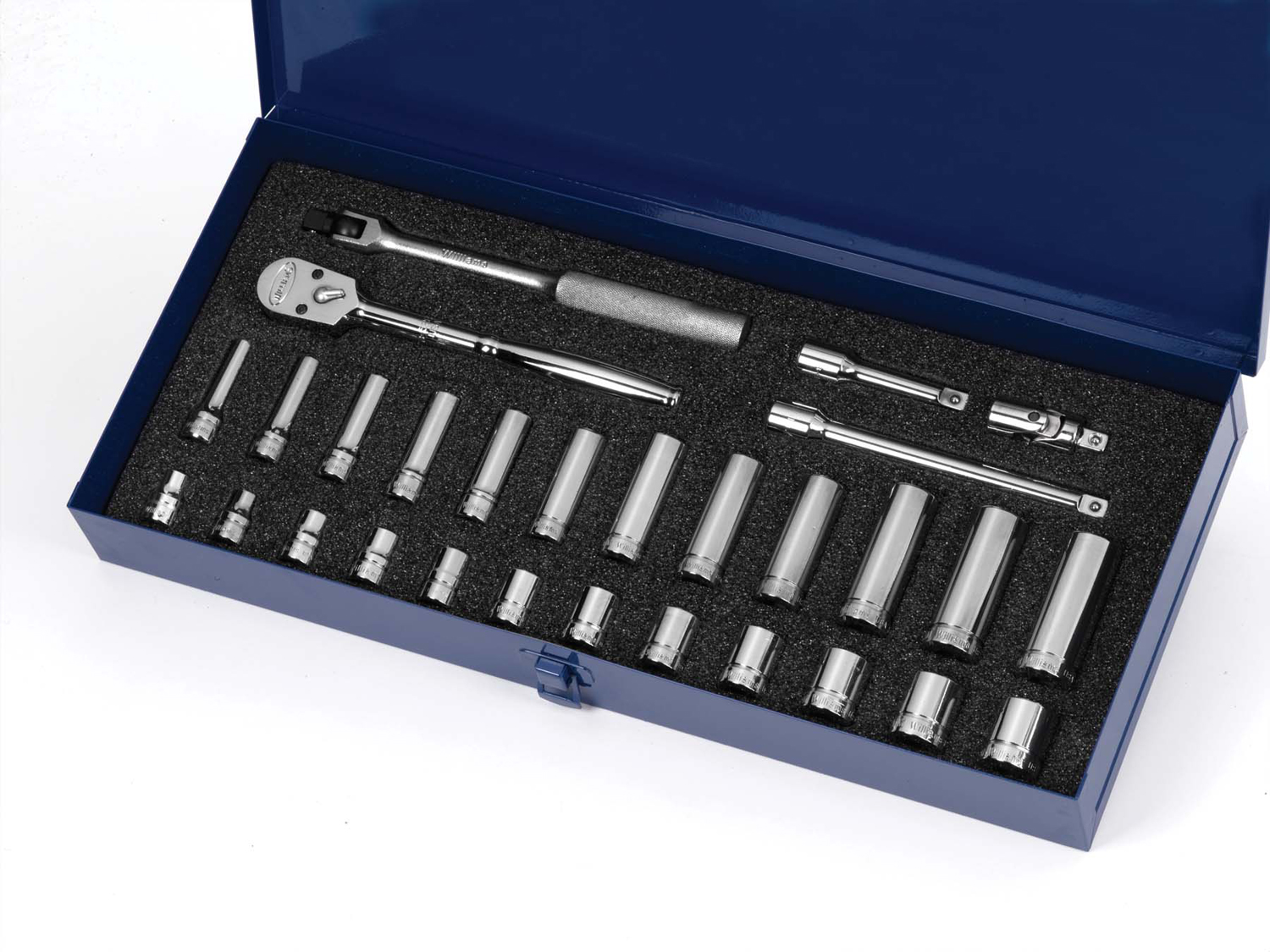 - This set includes an 8” Ratchet, 2 Extensions, 2 Drive Tools, Shallow 6 Point Sockets, Deep 6-Point Sockets