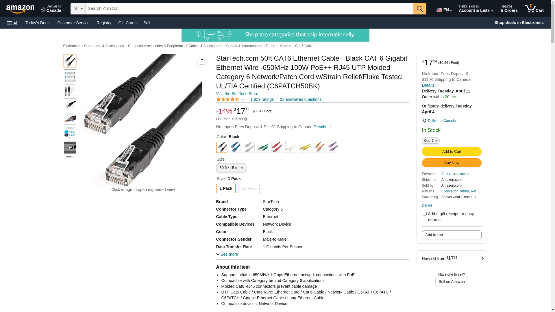 | Feature | Network Cable Type: Patch Cable| Cable Technology: Unshielded twisted pair (UTP)| Left Connector Gender: Male| Right Connector Gender: Male| Left Connector Type: RJ-45| Right Connector Type: RJ-45| Networking / Compliant Standards: EIA/TIA-568B Category 6 , CSA, ETL| Features: Molded ; American Wire Gauge (AWG) 24 ; Wires per Cable 8 wire(s) ; Pairs per Cable 4 pair(s)| Length: 50 feet| Enclosure Color: Black| Service & Support Type: Lifetime Warranty| RoHS: Y |