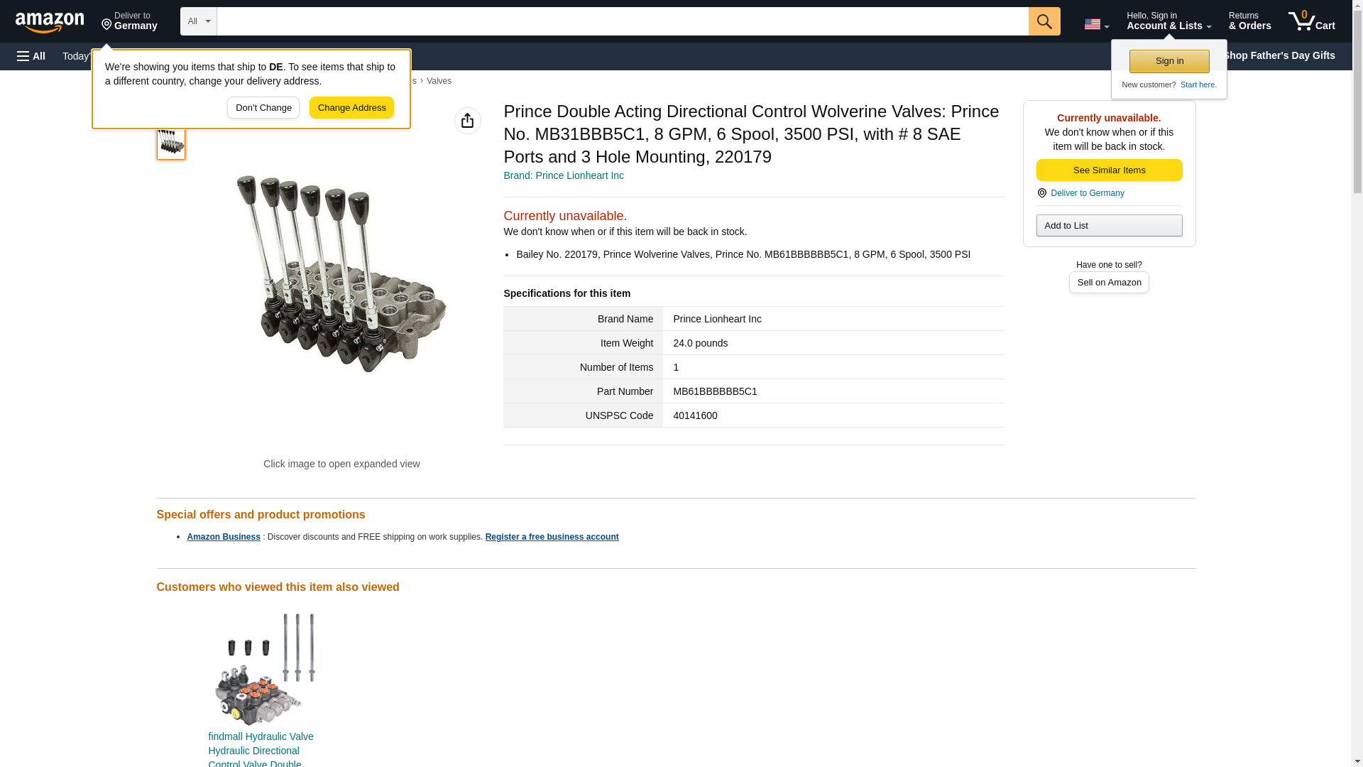 - Bailey No. 220179, Prince Wolverine Valves, Prince No. MB61BBBBBB5C1, 8 GPM, 6 Spool, 3500 PSI