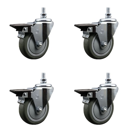 Polyurethane Swivel Threaded Stem Caster Set of 4 w/4" x 1.25" Gray Wheels and 10MM Stems - Includes 4 with Posi Lock Brakes - 1400 lbs Total Capacity - Service Caster Brand