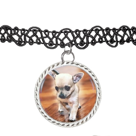 Chihuahua Dog Puppy Choker Pendant Charm Necklace. The image is displayed under photo-optic quality acrylic for a perfectly clear glossy image that is also protected from wear and tear. This listing is for choker necklace with charm pendant as pictured. The pendant is made of nickel coated brass and is approximately 7/8 inches (23mm) in diameter and weighs approximately 0.14 ounces (4 grams). The choker is black fabric and is approximately 12 inches long plus a 2 inch extension chain. 100% hand crafted in the USA. All items are 100% hand crafted in the USA at time of purchase. SKU #33274