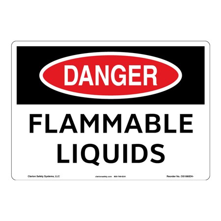 <p><strong>Word Message: </strong><br />FLAMMABLE LIQUIDS</p><p><strong>Description: </strong><br />Clarion Safety Systems brings you Danger Flammable Liquids safety signs (OS1080DH-) which are produced on premium plastic or aluminum material and are designed to meet your OSHA safety sign needs.<p><strong>Material Information:</strong></p> <ul> <li><strong>Material</strong>: (S4) Outdoor Weather Tuff Aluminum</li> <li><strong>Base Materials</strong>: .040" Rigid White Aluminum</li> <li><strong>Overlaminate</strong>: 3M .003 Ultra-Clear WeatherTuff UV resistant</li> <li><strong>Mounting Option</strong>: Mounting holes</li> <li><strong>Application</strong>: Indoor/Outdoor</li> <li><strong>MaxTemp</strong> (F): 175</li> <li><strong>MinTemp</strong> (F): -40</li> <li><strong>Chemical Resistance</strong>: Excellent</li> <li><strong>UV Resistance</strong>: Excellent</li> <li><strong>Outdoor durability</strong>: Excellent</li> <li><strong>Storage Stability</strong>: Stable. Optimum storage conditions: 72 F @ 50% relative humidity</li> <li><strong>Expected Life Indoor</strong>: Long term</li> <li><strong>Expected Life Outdoor</strong>: 5 - 10 years (expected outdoor life may vary due to climatic conditions)</li> <li><strong>RoHS</strong>: No</li> <li><strong>CRoHS</strong>: No</li> <li><strong>REACH</strong>: No</li> </ul>