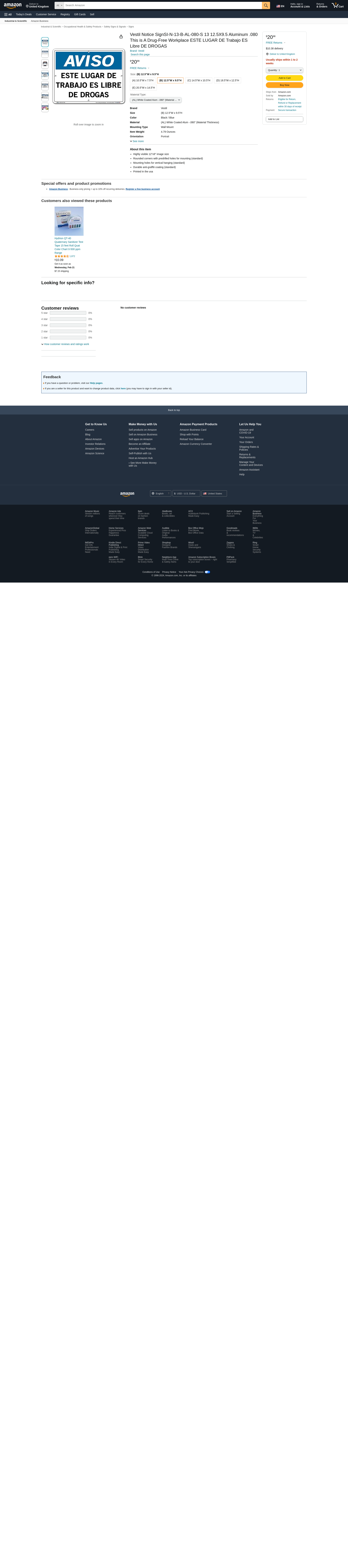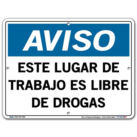 Vestil Notice SignSI-N-13-B-AL-080-S 13 12.5X9.5 Aluminum .080 This is A Drug-Free Workplace ESTE LUGAR DE Trabajo ES Libre DE DROGAS
