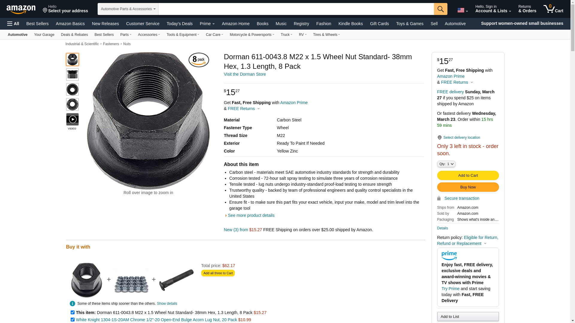 Dorman 611-0043.8 M22 x 1.5 Wheel Nut Standard- 38mm Hex, 1.3 Length, 8 Pack