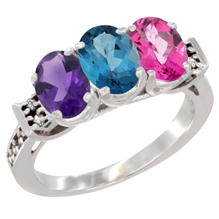 14K White Gold Natural Amethyst, London Blue Topaz & Pink Topaz Ring 3-Stone 7x5 mm Oval Diamond Accent, sizes 5 - 10
