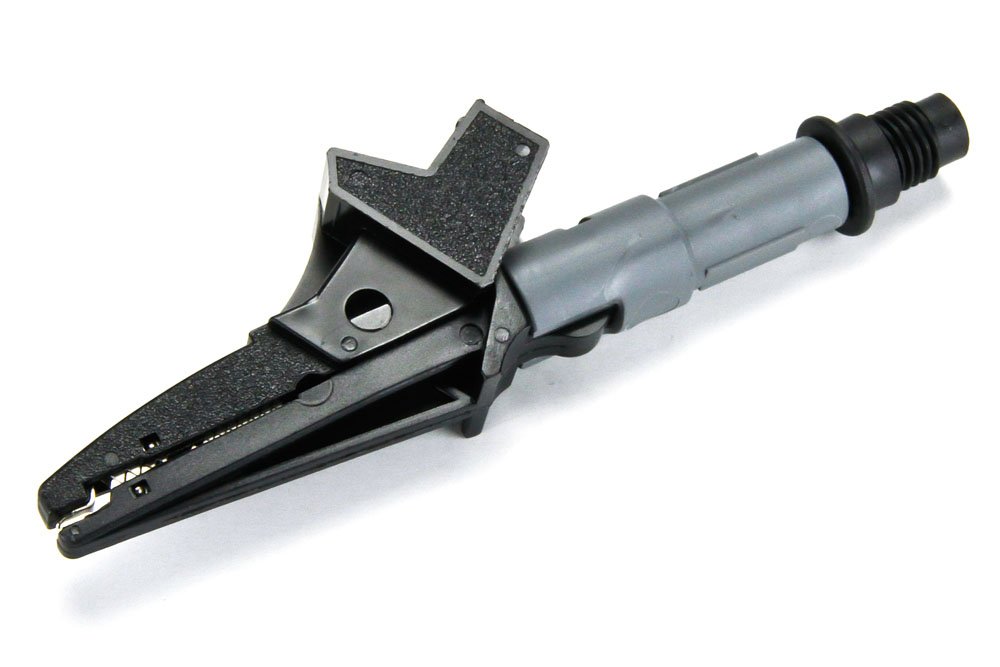 Insulated alligator clip with thread for assembly to digital multimeter fused probe bodies. Polyamide (Nylon) body material. Nickel plated brass contact. 1,000 V CAT III IEC rating. Black color. An alligator clip is a type of spring-loaded clip. Commonly used in making temporary electrical connections, alligator clips have serrated jaws. Alligator clips with crimp or solder connections. Current max: 20 A. Resistance max: 20 mohm. Temperature: -20 to +80 degree C. RoHS compliant.
