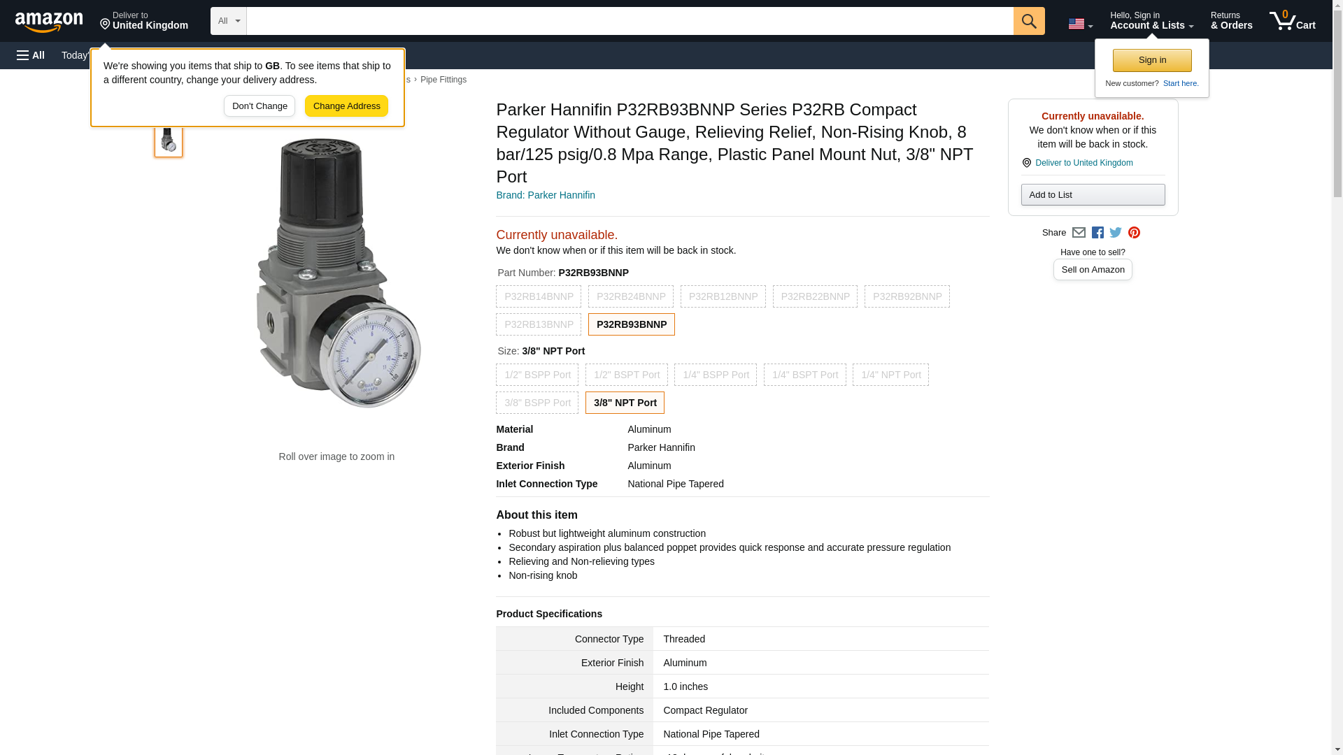 Parker Hannifin P32RB93BNNP Series P32RB Compact Regulator Without Gauge, Relieving Relief, Non-Rising Knob, 8 bar/125 psig/0.8 Mpa Range, Plastic Panel Mount Nut, 3/8" NPT Port