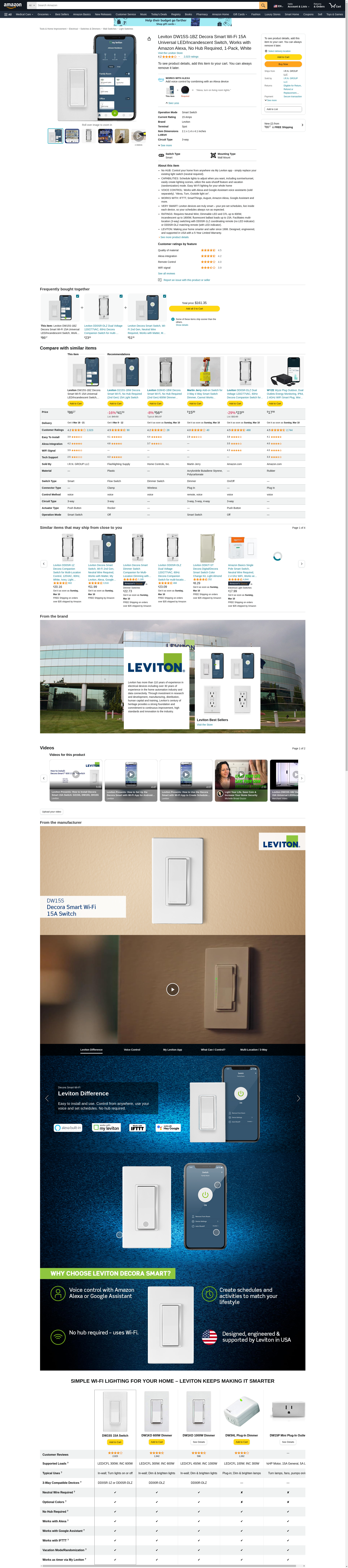 Leviton DW15S-1BZ Decora Smart Wi-Fi 15A Universal LED/Incandescent Switch, Works with Amazon Alexa, No Hub Required, 1-Pack, White