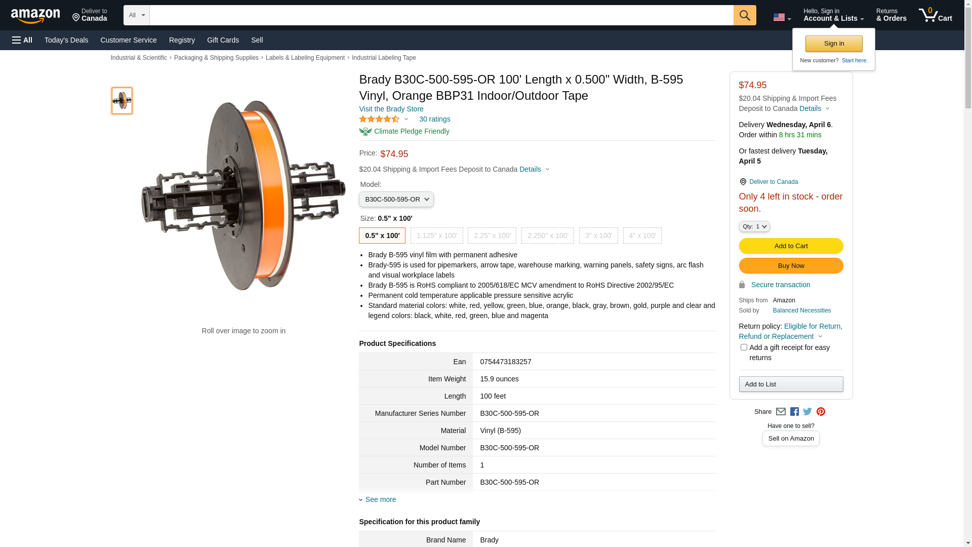 <p><strong>Brady, B30C-500-595-OR, 142018 B30 0.5" x 100' Orange Indoor/Outdoor Vinyl Label</strong></p><p>This durable, low-shrink vinyl with ultra-aggressive adhesive is ideal for labeling pipes, equipment, shelves and nearly any other industrial surface.</p><ul><li>Highly pliable material with high-tack permanent adhesive for rough, highly textured, dirty and harsh environment surfaces--including outdoors</li><li>Conforms and adheres to "difficult" surfaces like painted cinder blocks, painted wood, textured plastic, paper-jacketed pipes and blow-molded cases</li><li>Resistant to exposure to chemicals, greases and oils, salt spray, cleaners and detergents and general industrial grime</li><li>8-10 year average outdoor durability in temperatures from -40 DegreeF to 180 DegreeF (-40 DegreeC to 82 DegreeC); can be applied as low as 0 DegreeF (-18 DegreeC)</li></ul>