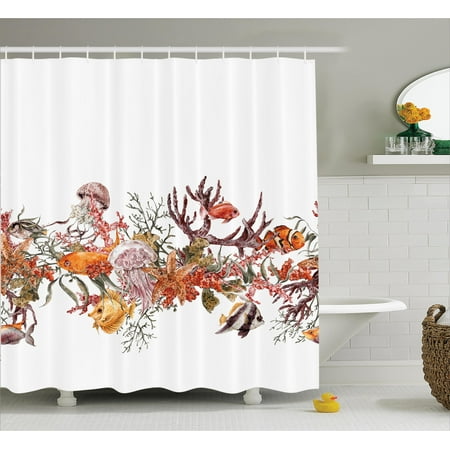 Ocean Life Shower Curtain Set, Illustration with Fish Seaweed Starfish Coral Algae Jellyfish Sea Life Summertime, Bathroom Decor, Mustard Olive, by Ambesonne