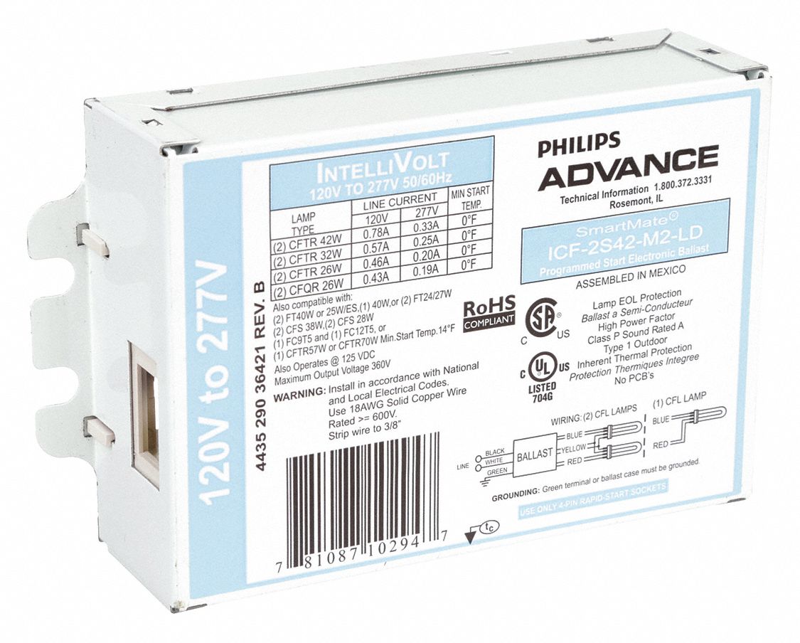 - SmartMate 120/277V electronic CFL ballast, programmed start, for use with (2) 42W 4-pin compact