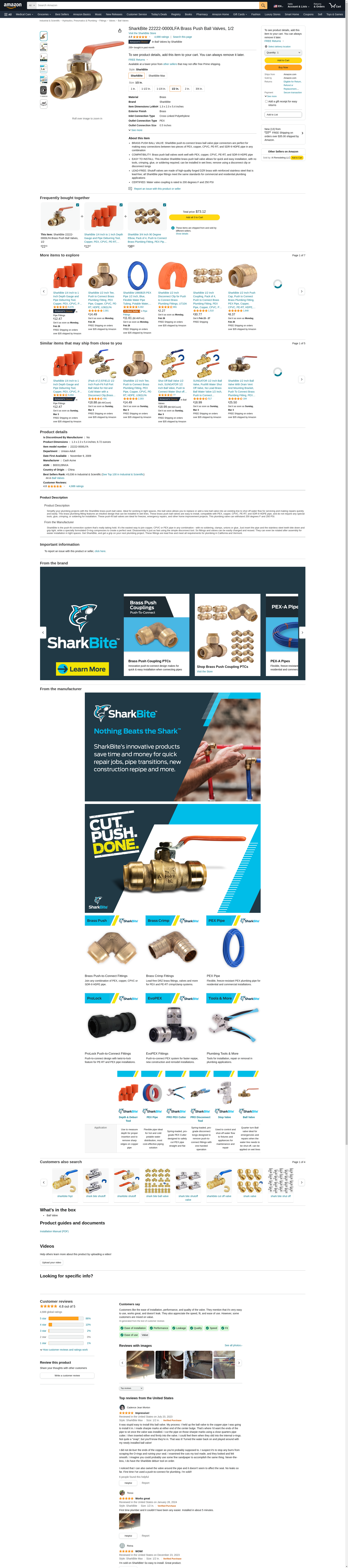SharkBite 22222-0000LF Brass Push Ball Valves, 1/2