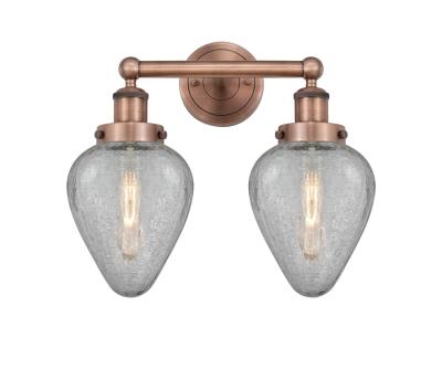 INNOVATIONS 616-2W-AC-G165 Geneseo 2 15 inch Bath Vanity Light Antique Copper. Style: Industrial, Modern Contempo, Restoration-Vintage, Transitional . Collection Name: Edison. Metal Finish(Body): Antique Copper. Metal Finish(Canopy/Backplate): Antique Copper. Material: Steel, Cast Brass, Glass. Dimension(in): 11.5(H) x 15(W) x 7.5(Ext). Bulb: (2)60W Medium Base Incandescent(Not Included). Voltage: 120. Dimmable: Yes. Color Temperature (Kelvin): 2200. Color Rendering Index (CRI): 99.9. Lumens: 220. Life Expectancy (Hours): 2000. Glass Shade Description: Clear Crackle Geneseo. Glass Type: Crackled. Shade Shape: Teardrop. Glass or Metal Shade Color: Clear Crackled. Shade Material: Glass. Shade Dimension(in): 6.5(W) x 8.75(H). Fitter Measurement (Glass Or Metal Shade Fitter Size): 3.25 inch Fitter. Backplate Dimension(in): 4.5(W) x 0.75(Depth). ADA Compliant: No. California Proposition 65 Warning Required: Yes. UL/ETL Certification Type: Damp Location.
