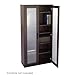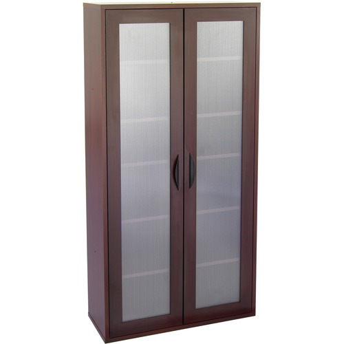 5/8amp;quot; thick compressed wood cabinetry with a durable laminated finish. Hinged doors feature translucent plastic inserts for a modern appearance. Contemporary black elliptical door pulls. Black back. Shelf count incluldes bottom of cabinet. Color: Mahogany Overall Width: 29 3/4amp;quot; Overall Depth: 11 3/4amp;quot; Overall Height: 59 1/2amp;quot;.