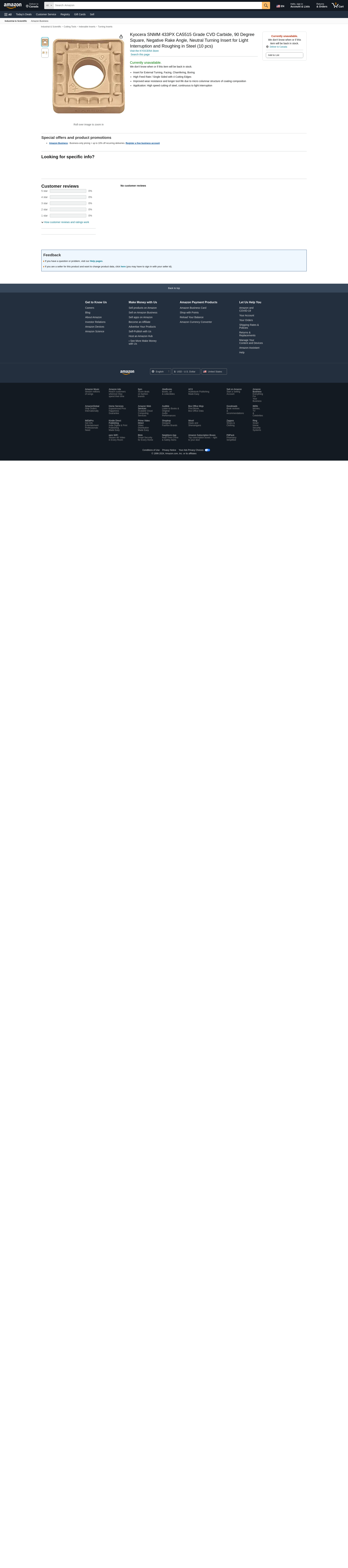 <ul><li>Insert for External Turning, Facing, Chamfering, Boring</li><li>High Feed Rate / Single Sided with 4 Cutting Edges</li><li>Improved wear resistance and longer tool life due to micro columnar structure of coating composition</li><li>Application: High speed cutting of steel, continuous to light interruption</li></ul><p>Product Details:</p><ul><li>Insert Style: SNMM</li><li>Insert Size: 433</li><li>Chipbreaker: PX</li><li>Insert Grade: CA5515</li><li>Material: Carbide</li><li>Material Grade: Micro Columnar</li><li>Coating Process: CVD</li><li>Coating / Composition: TiCn/al2O3/TiN</li><li>[IC] Inscribed Circle (Decimal Inch): 0.5000</li><li>[IC] Inscribed Circle (mm): 12.70</li><li>[S] Thickness (Decimal Inch): 0.1875</li><li>[S] Thickness (mm): 4.76</li><li>[RE] Corner Radius (Decimal Inch): 0.0469</li><li>[RE] Corner Radius (mm): 1.19</li><li>[D1] Hole Diameter (Decimal Inch): 0.2031</li><li>[D1] Hole Diameter (mm): 5.16</li><li>Rake: Negative</li><li>[AN] Relief Angle (Degree): 0</li><li>Included Angle (Degree): 90</li><li>Primary Workpiece Material: Steel</li><li>Shape: Square</li><li>Cutting Edge Style: High Feed Rate / Single Sided</li><li>Insert Hand: Neutral</li><li>Insert Holding Method: Screw</li><li>Number of Cutting Edges: 4</li><li>Series: CA55-Series</li><li>Application: External Turning, Facing, Chamfering, Boring</li><li>Usage Classification: Light Interruption</li><li>Hole (Yes/No): Yes</li><li>Cutting Range: Roughing</li><li>Compatible Holders (Partial): DSBNR...-12, DSBNL...-12, MSSNR...-4…, MSSNL...-4…, PSBNR…-12, PSBNL…-12, PSKNR…-12, PSKNL…-12, PSSNR…-12, PSSNL…-12, PSDNN…-12, HSRNR...-4D, HSRNL...-4D, HSDNN...-4D, ...DSKNR12..., ...DSKNL12...</li></ul>