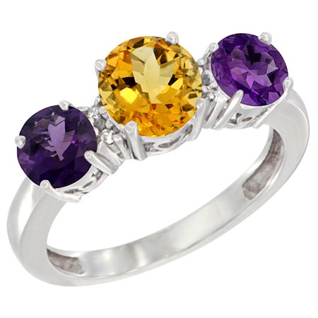 14K White Gold Round 3-Stone Natural Citrine Ring & Amethyst Sides Diamond Accent, sizes 5 - 10