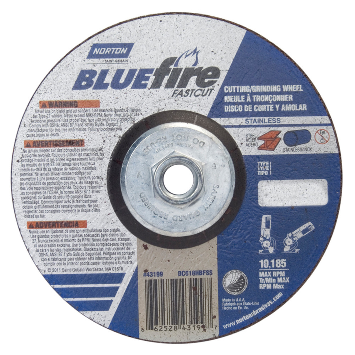 Norton Blue Fire Plus Fast Cut Depressed Center Abrasive Wheel, Type 27, Zirconia Alumina and Aluminum Oxide, 5/8"-11 Hub, 6" Diameter x 1/8" Thickness (Pack of 1)