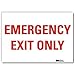 | Feature | <b>Price For:</b> Pack of 2 <b>OSHA Compliant</b>: Yes <b>Glow-in-the-Dark</b>: No <b>Double-Sided</b>: No <b>Sign Shape</b>: Rectangle <b>ANSI Compliant</b>: Yes <b>UV Resistant</b>: Yes <b>Operating Temp. Range</b>: -30 Degrees to 200 Degrees F <b>Retroreflective Grade</b>: Engineer <b>Legend</b>: Emergency Exit Only <b>Thickness</b>: 0.001" <b>Width</b>: 5" <b>Legend Style</b>: Text <b>Item</b>: Emergency Exit Sign <b>Height</b>: 7" <b>Header</b>: No Header |