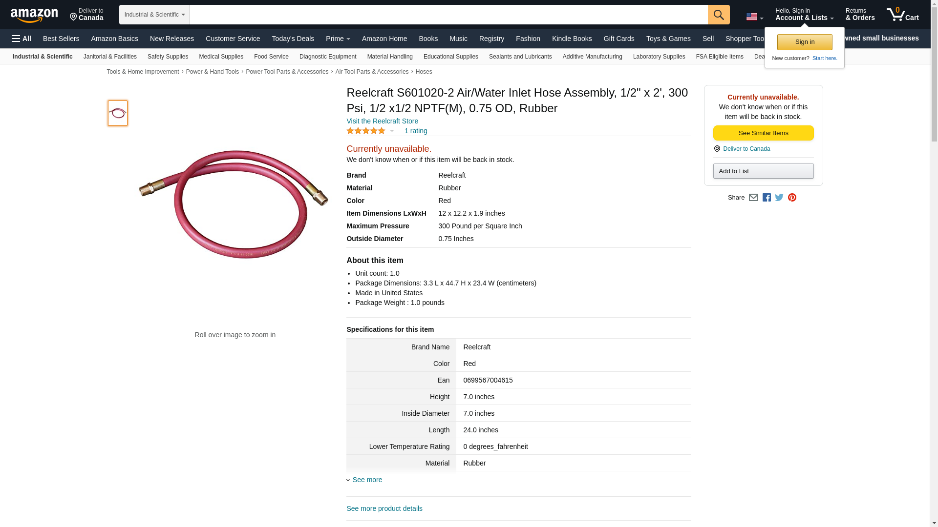 Reelcraft S601020-2 Air/Water Inlet Hose Assembly, 1/2" x 2', 300 Psi, 1/2 x1/2 NPTF(M), 0.75 OD, Rubber